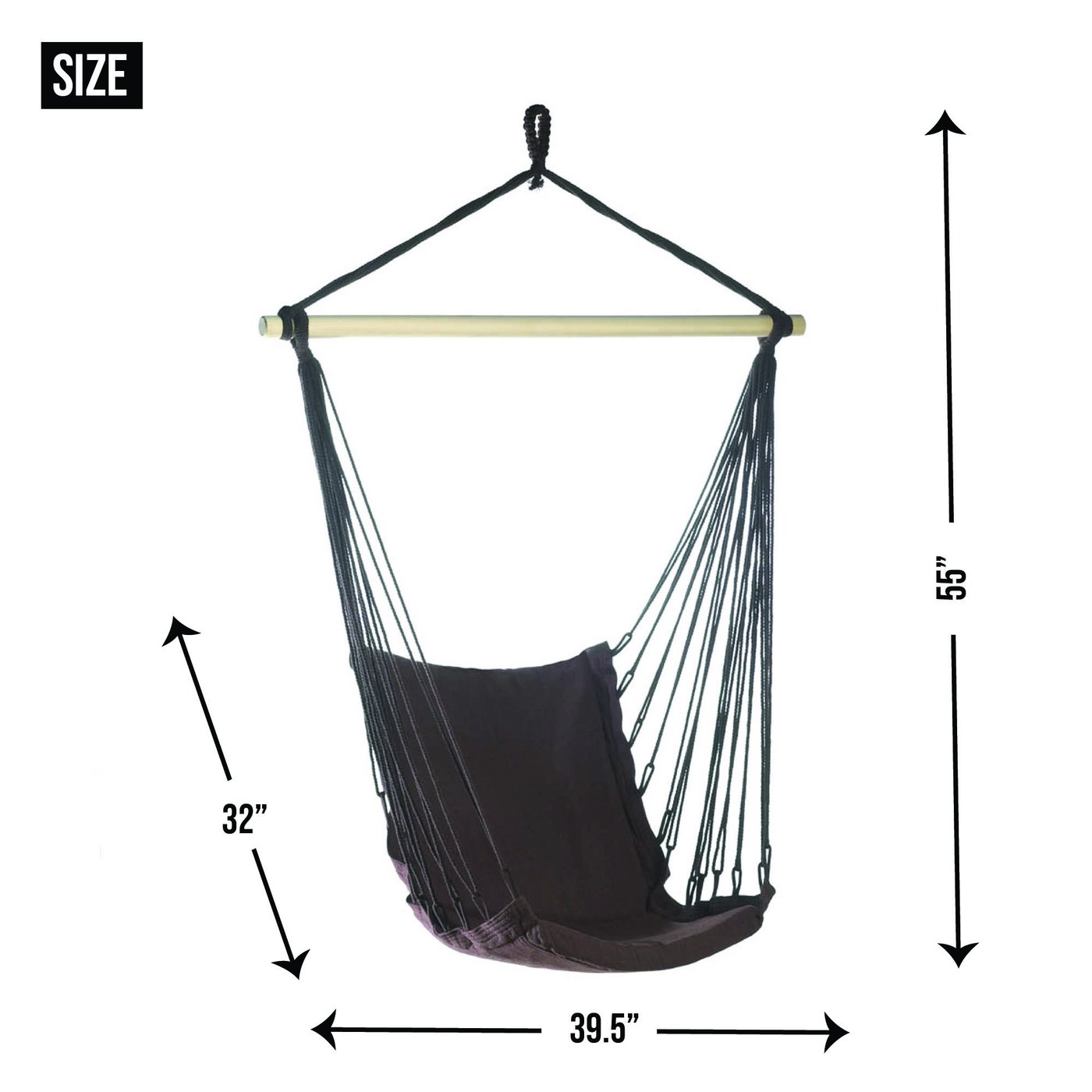 • This will be your favorite seat, indoors or out! Espresso-colored cushions held by matching rope and a wooden frame, all designed to give you a premium outdoor seat for relaxing as you sway with the summer breeze.