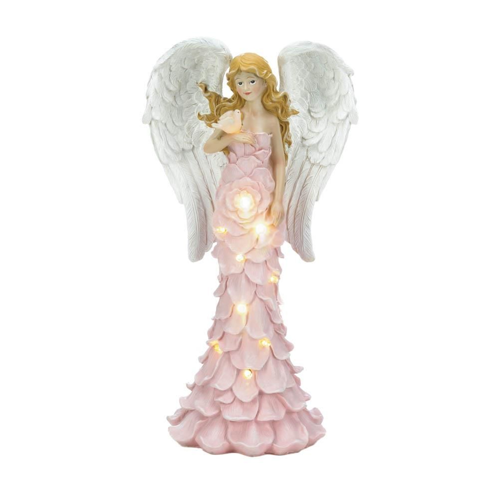 • Add a calming presence to your outdoor space with this charming angel garden statue. This beautiful garden angel features a solar powered design that illuminates the pink rose dress and the bird at night.