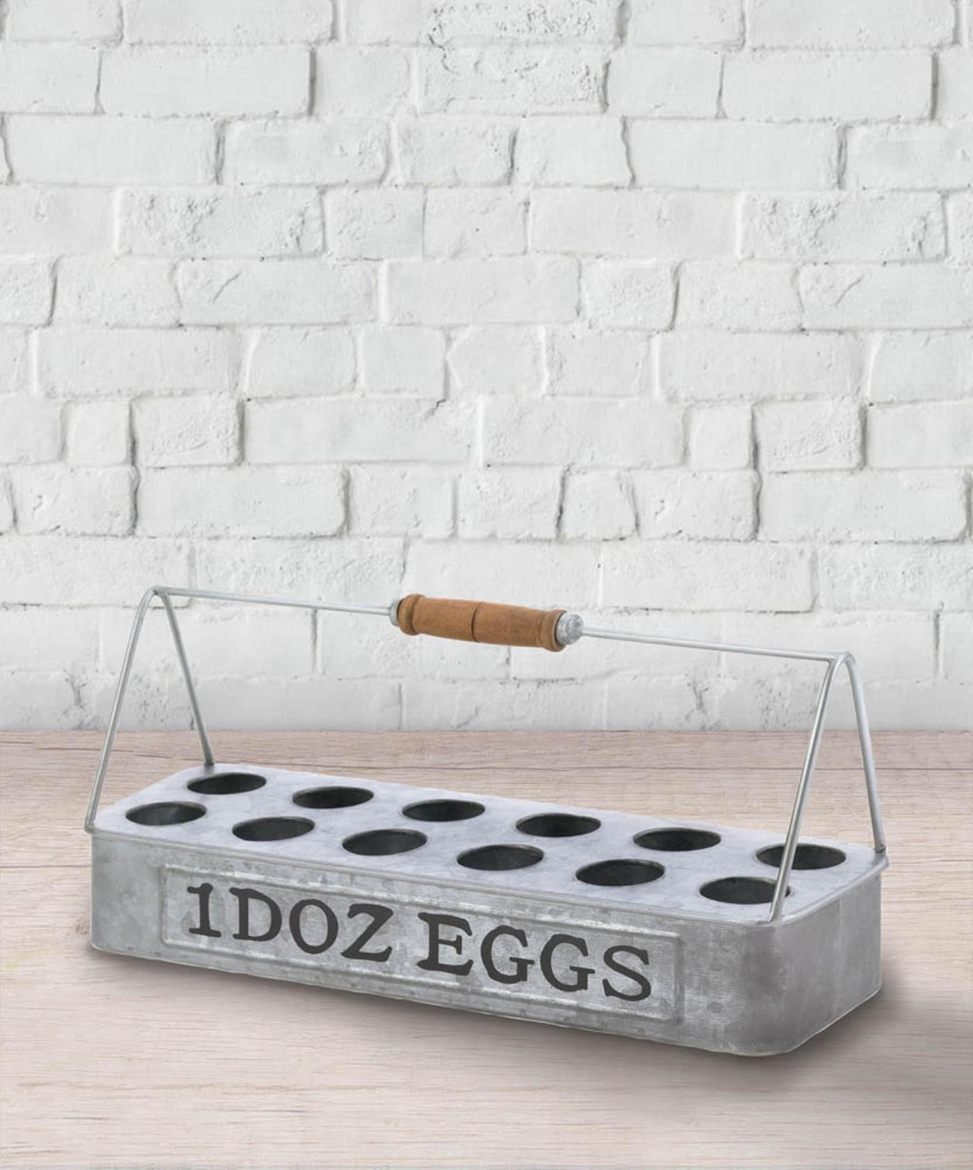 • This galvanized egg basket is a chic way to collect and store your eggs. Perfect for Farmhouse-style décor or those with backyard coops, this egg holder includes enough spots to carry a dozen eggs.