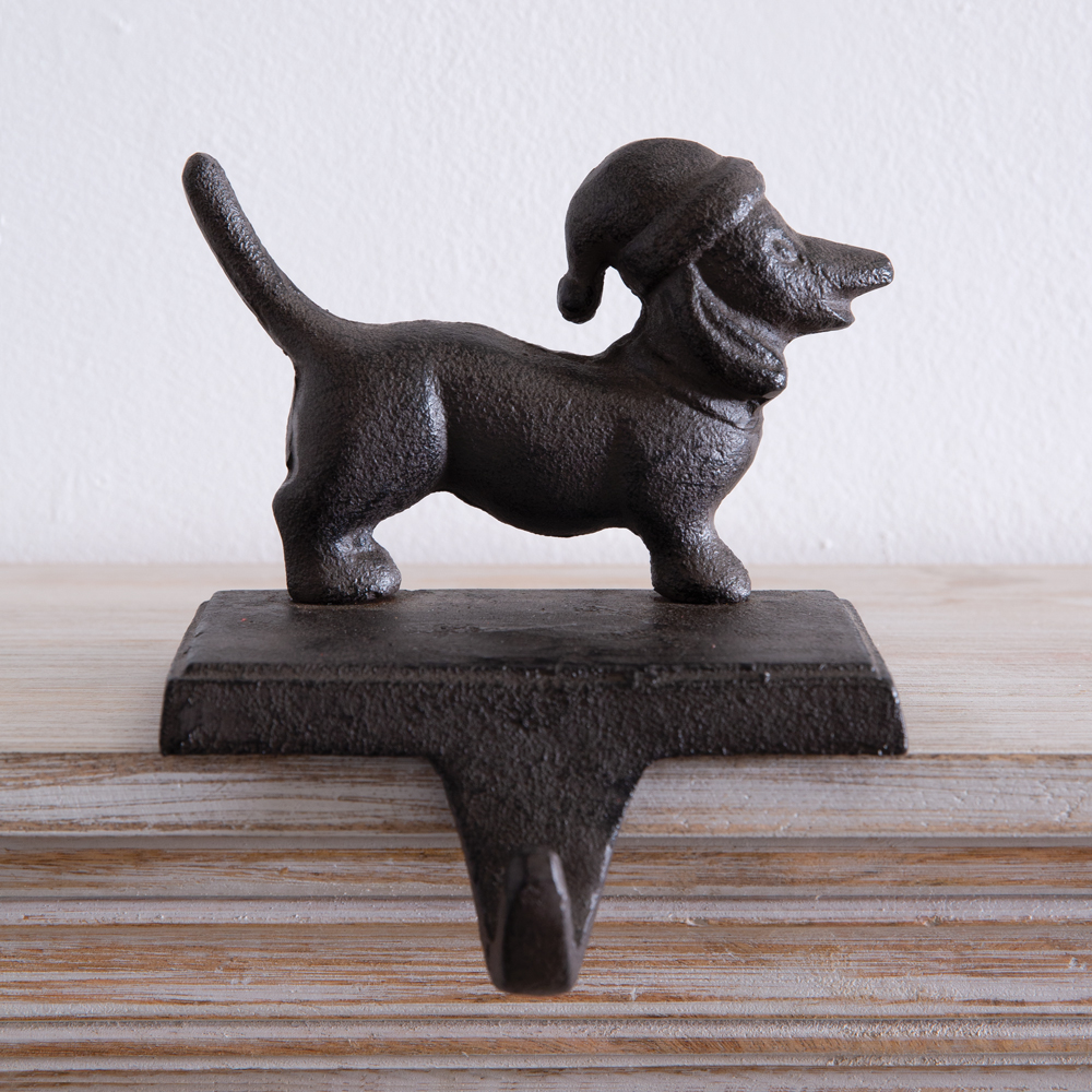 Our furry friends deserve Christmas treats too! Place this Dachshund Stocking Holder among your own on the mantle to surprise your fur child with bones and toys from Santa. Item is made of cast iron. Holds a normal sized stocking.