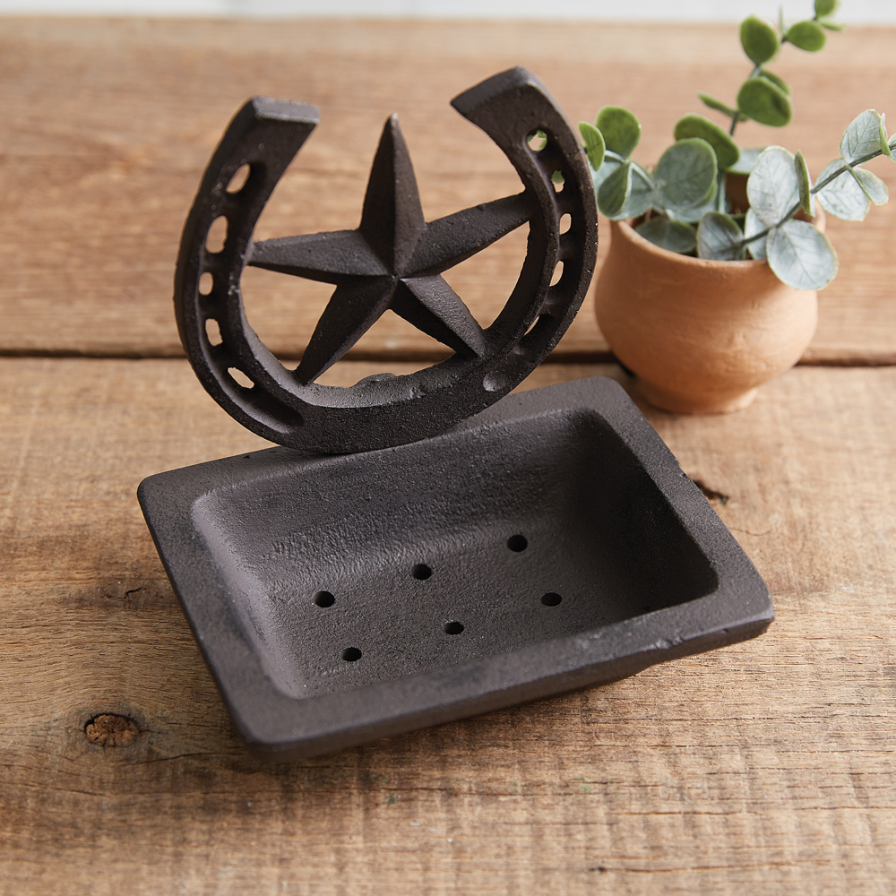 Wash up from a long day of riding horses with this western soap dish. Display in your bathroom or kitchen to accent any western cabin or country home. A star and horseshoe adorns the top of the dish. Item is made of cast iron and features drain holes for ease of cleaning.