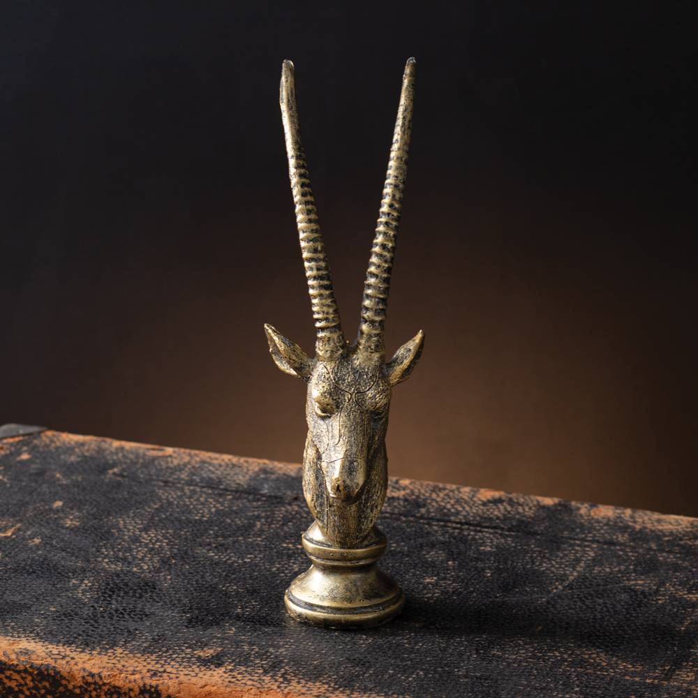 Our gazelle figurine features an elegant, antique gold finish and can be placed among books and trinkets on a tabletop. Item is fashioned of resin.